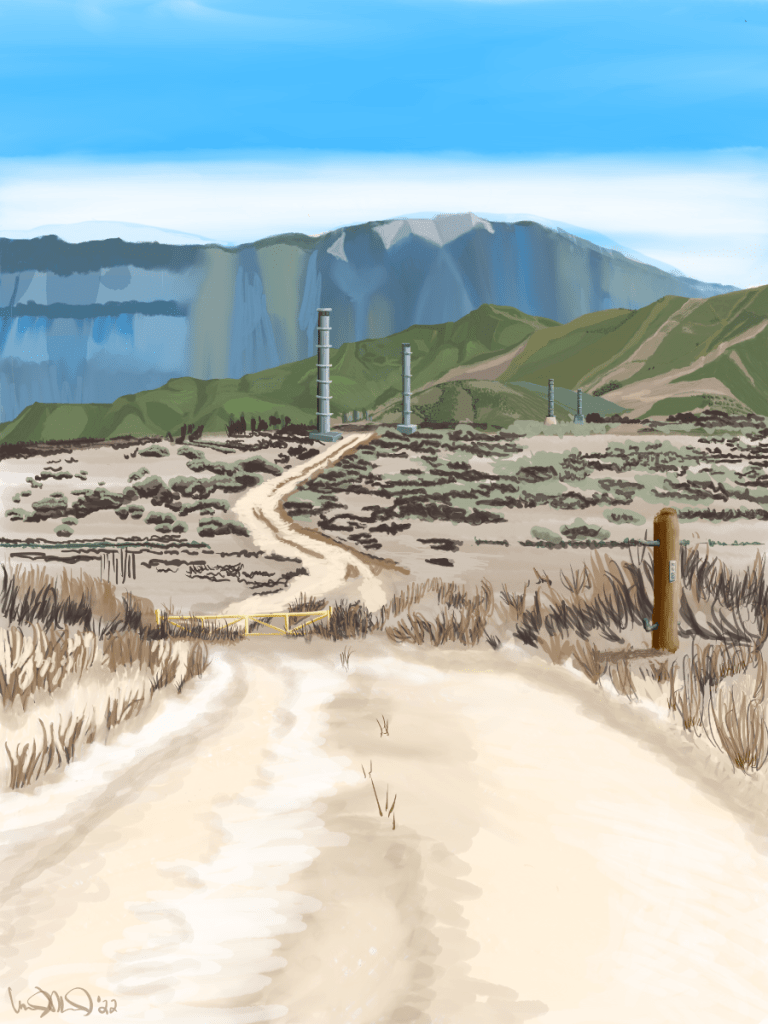 Near my house in Southern California is an open space between the low hills that is called Skunk Hollow. I found the access road disappearing into the distance as the aqueduct vent towers approach in the hollow between hills to be a very interesting subject.